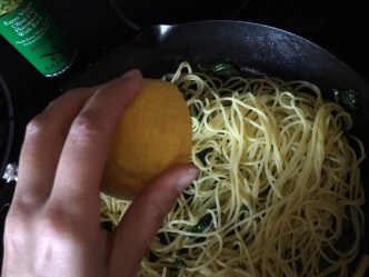 I laid the fish out on paper towels to dry off while I boiled noodles to al dente and drained them. In the meantime, I heated butter (the REAL stuff, people) in a cast iron skillet with minced garlic and fresh spinach. After it cooked down for a few minutes, I tossed the pasta into the skillet and added the lemon and chopped parsley.